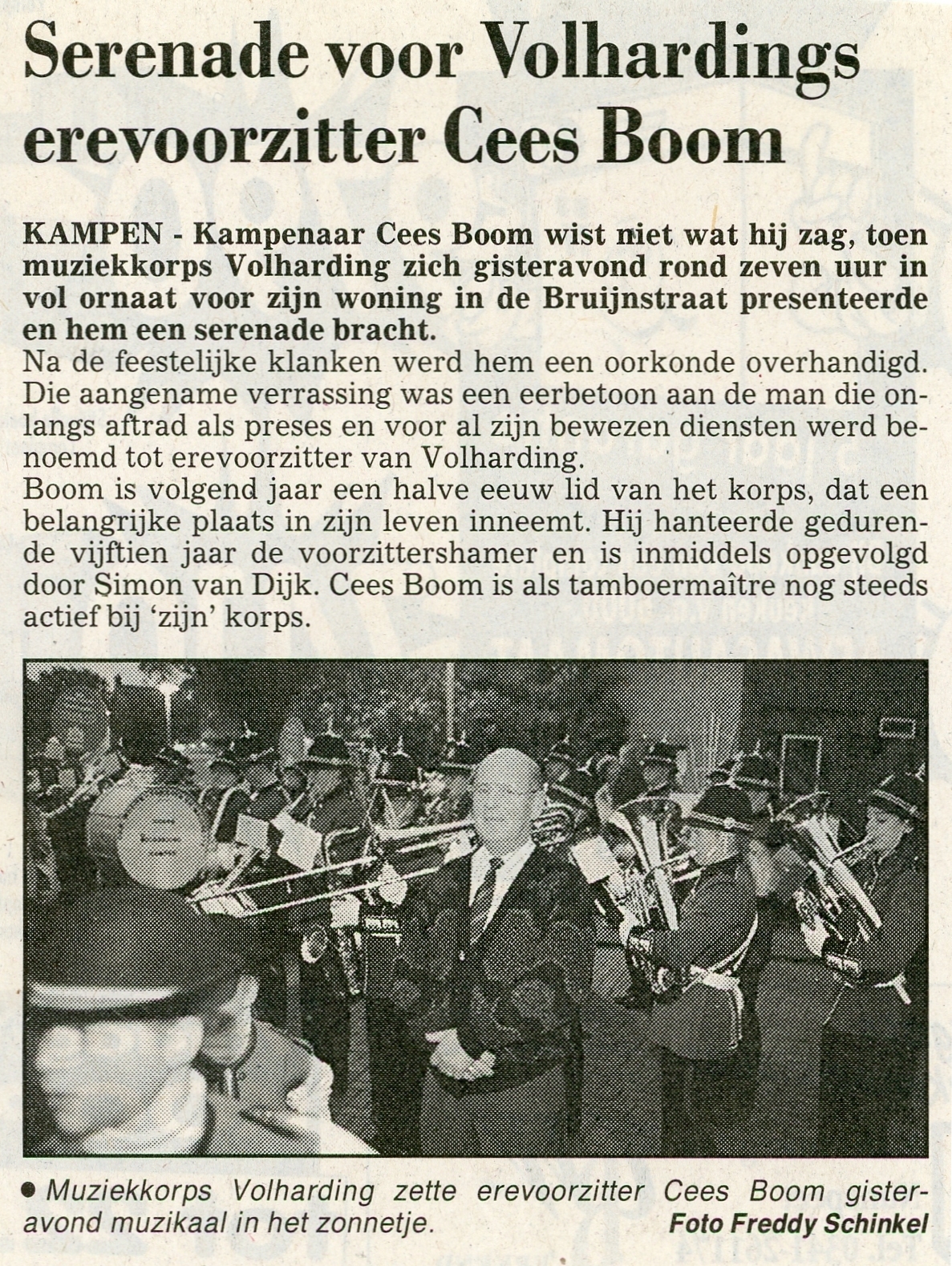 Cees Boom komt uit Kampen. Cees werd in 1948 lid van muziekvereniging Volharding. In 1983 volgde hij Toon van den Berg op als voorzitter en bleef die rol tot 1998 met succes vervullen. Voor die vijftien jaar inzet voor de vereniging werd Cees benoemd tot ere-voorzitter. Hij werd opgevolgd door Simon van Dijk.